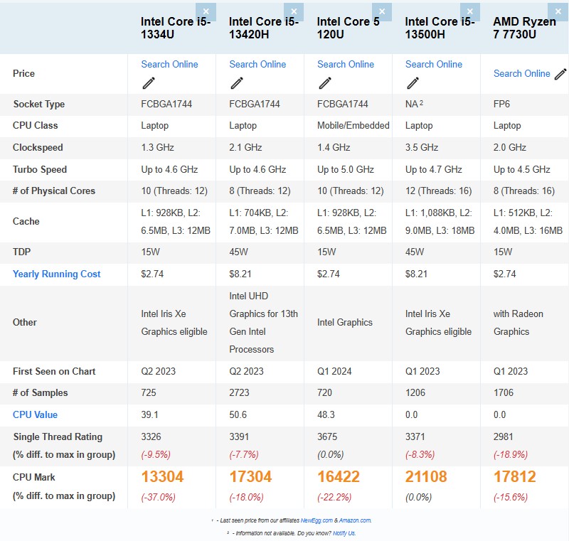 從表格當中我們可以得知,效能排行分別為:i5-13500H(12核心) > AMD Ryzen 7 7730U(8核心) > i5-13420H(8核心) >= Core 5 120U(10核心) > i5-1334U(10核心)。到這邊,可能有些小夥伴開始理解核心數與效能並不成正比的事情,但也可能有小夥伴們開始有疑問『小編,照你這個說法,那不就挑高效能的買就好,為什麼還要出其他的款式處理器呢?』