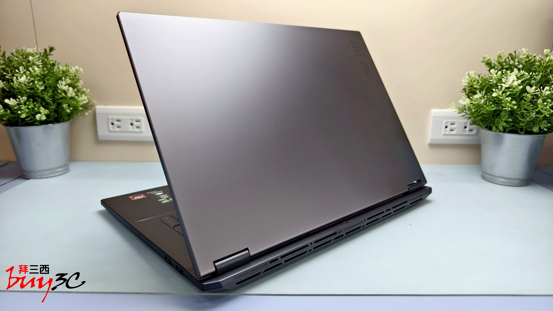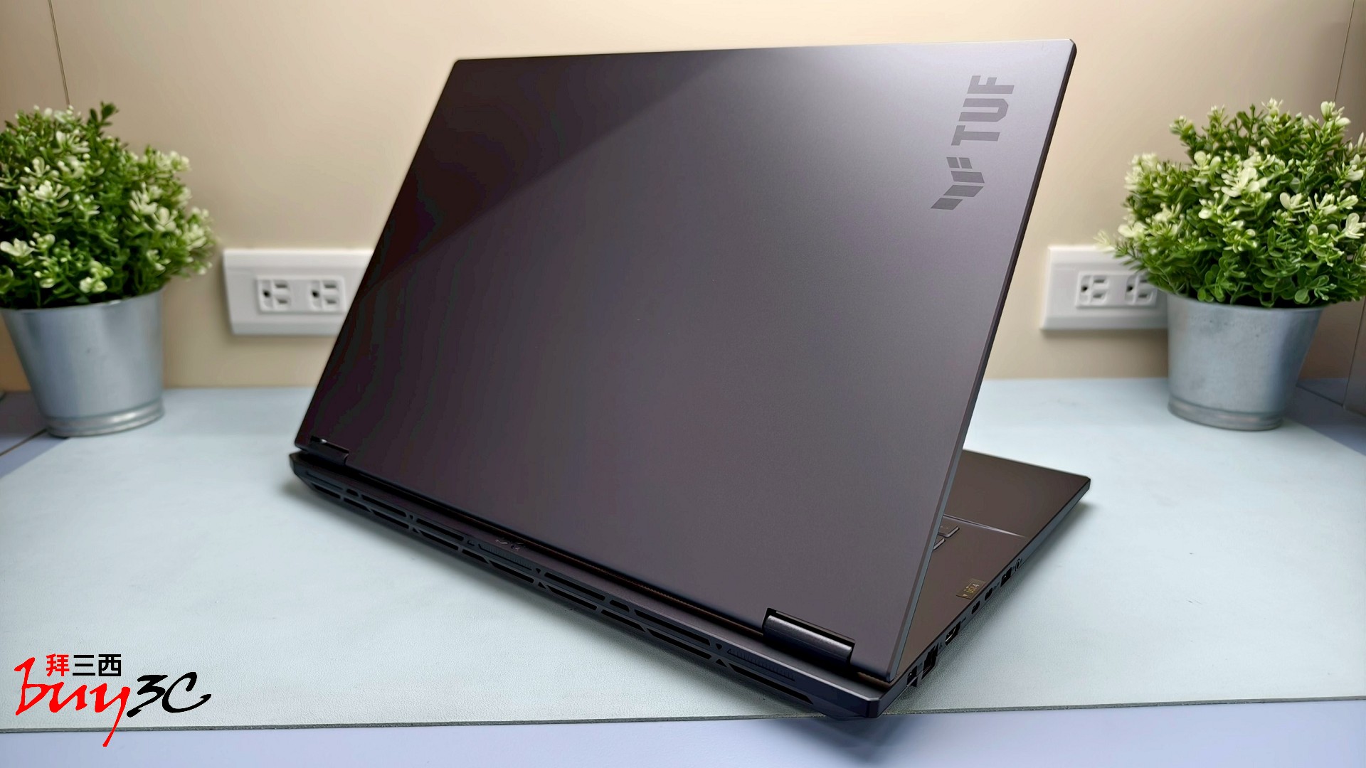 打開外箱,迎接我的是一片深邃的御鐵灰金屬上蓋,霧面質感摸起來細膩且不易沾指紋。上蓋僅有右上角TUF的字樣標誌,沒有過多裝飾,簡約中帶著力量感。這種設計特別適合那些既想低調又想炫酷的玩家,隨時隨地都能展現專業風範。