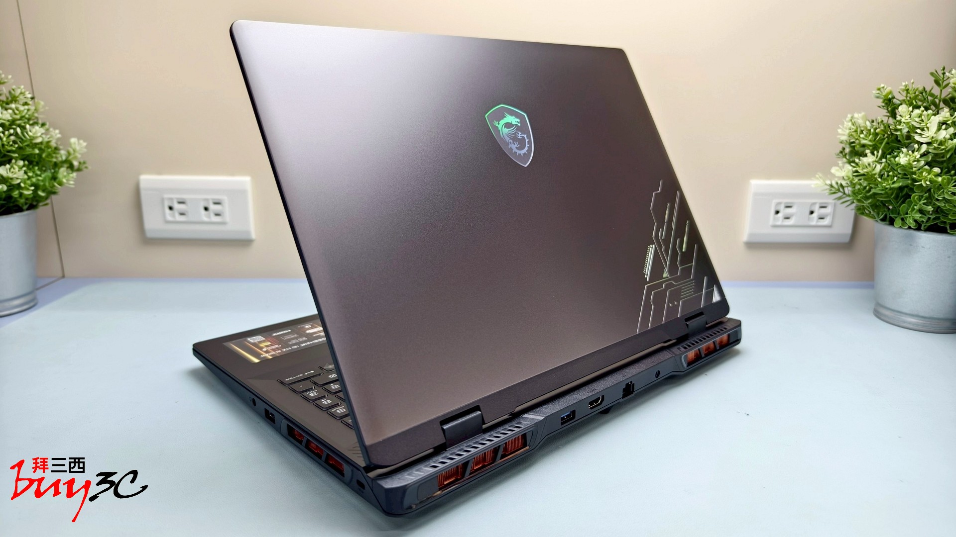 『MSI Crosshair 16 HX AI』重量約 2.63 公斤,變壓器約 0.733 公斤,厚度最薄處 22.4 mm,最厚處 30.8 mm。老實說,單手拿起時有些吃力,但若考量其高規格與效能表現,這樣的重量還算略為能接受。不過,背包可能需要特別選用更符合尺寸承重需求的款式。