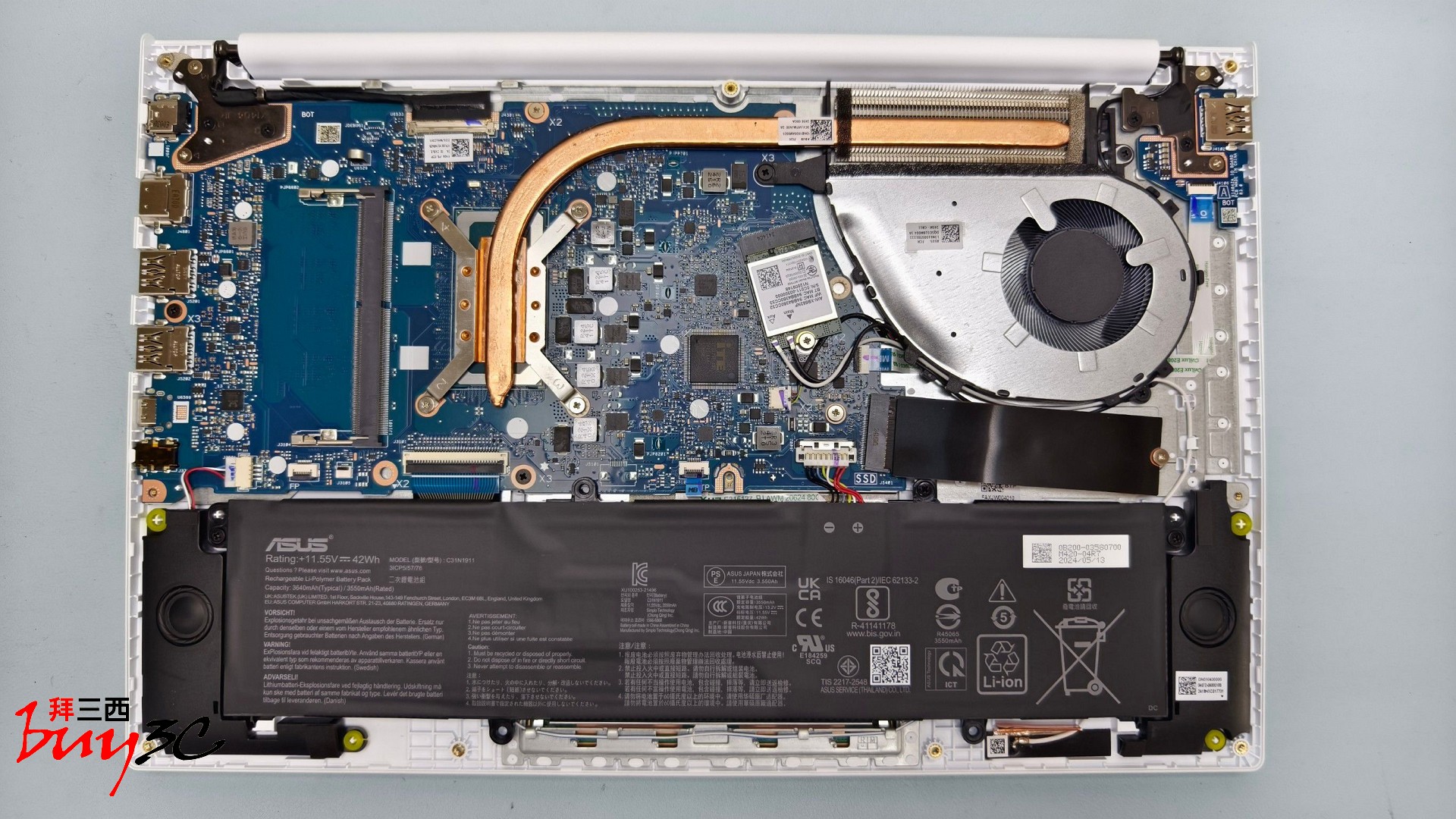 拆開背蓋後,我們看到了輕薄筆電中少見的「誠意」。X1404VA 並非採用全焊死的設計,而是保留了記憶體擴充插槽,且 M.2 PCIe SSD 亦可進行更換。這點非常加分,代表未來覺得速度不夠時,還有升級的空間。